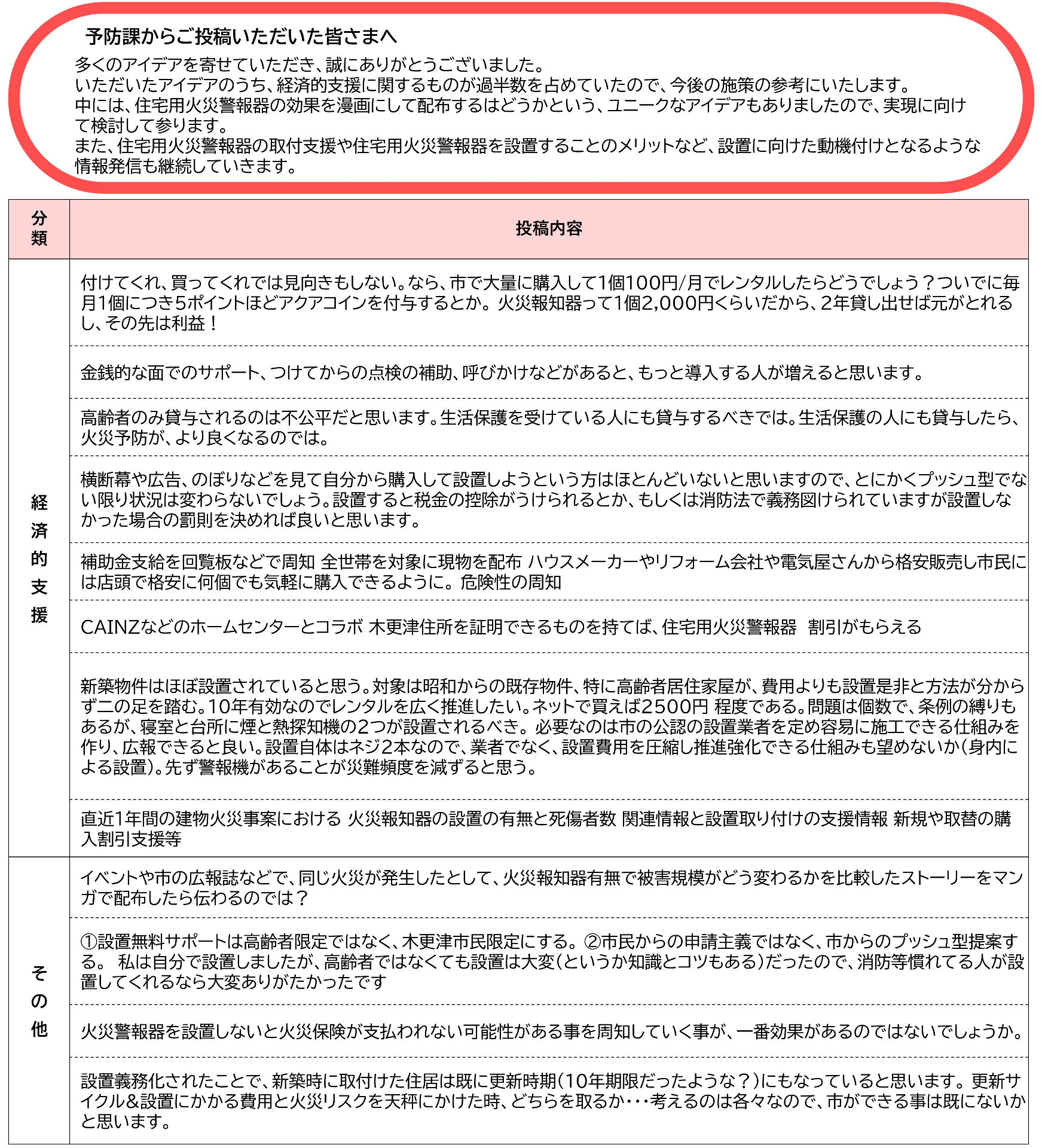 「住宅用火災警報器の設置を促進するために、市ができそうなことや住民の目や耳に入りやすく、関心を持ってもらいやすい伝え方・アプローチのアイデアを教えてください!」