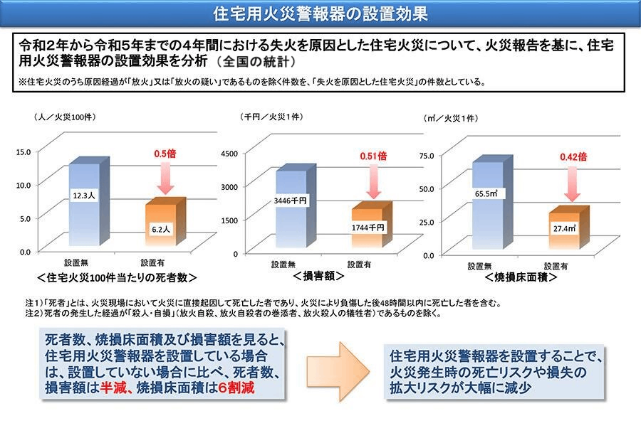 ⑤ 火災の早期発見により自宅内だけの損害にとどめられれば、近隣宅への類焼を防げる。