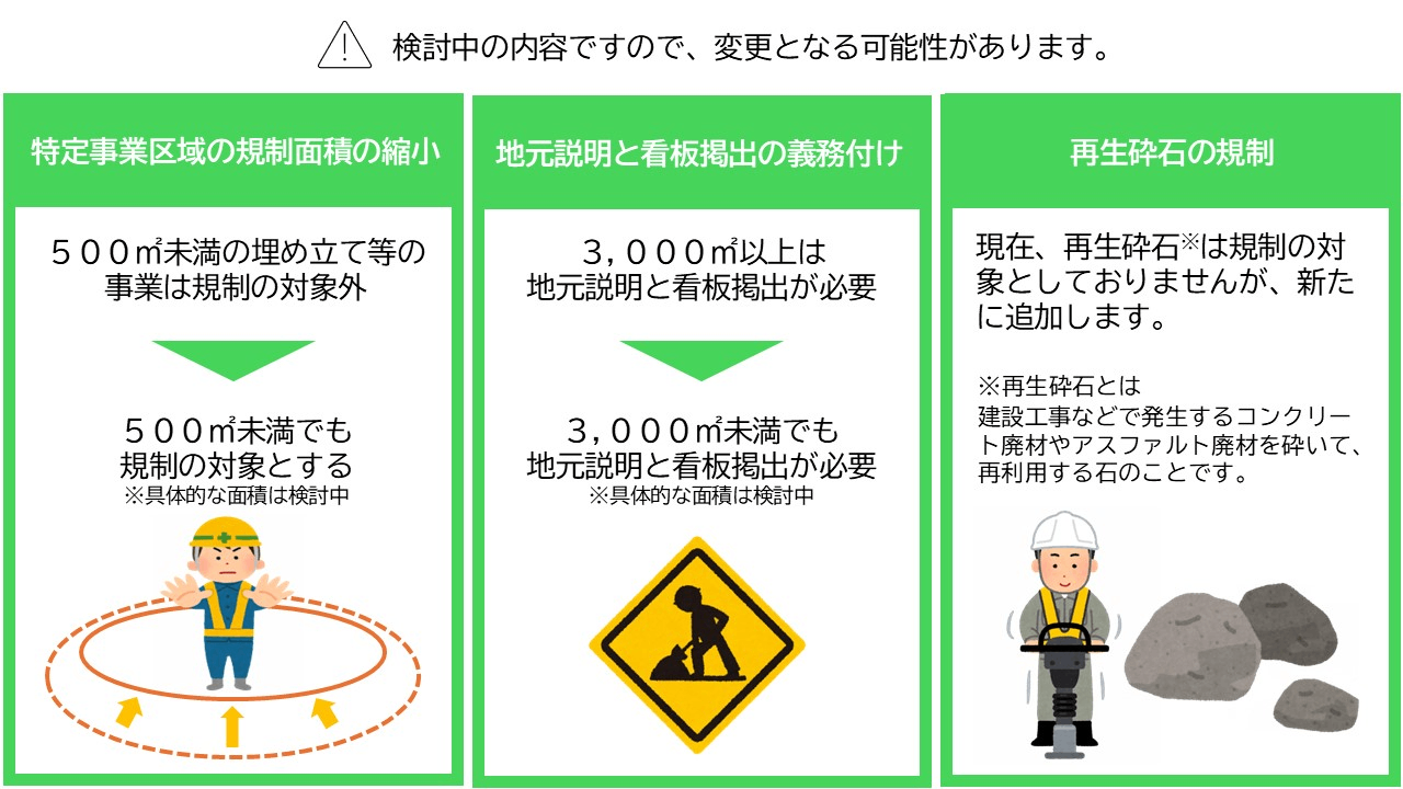 規制面積の変更など、残土の埋立てが市民の理解の下に行われる条例となるよう改正を行う予定です。