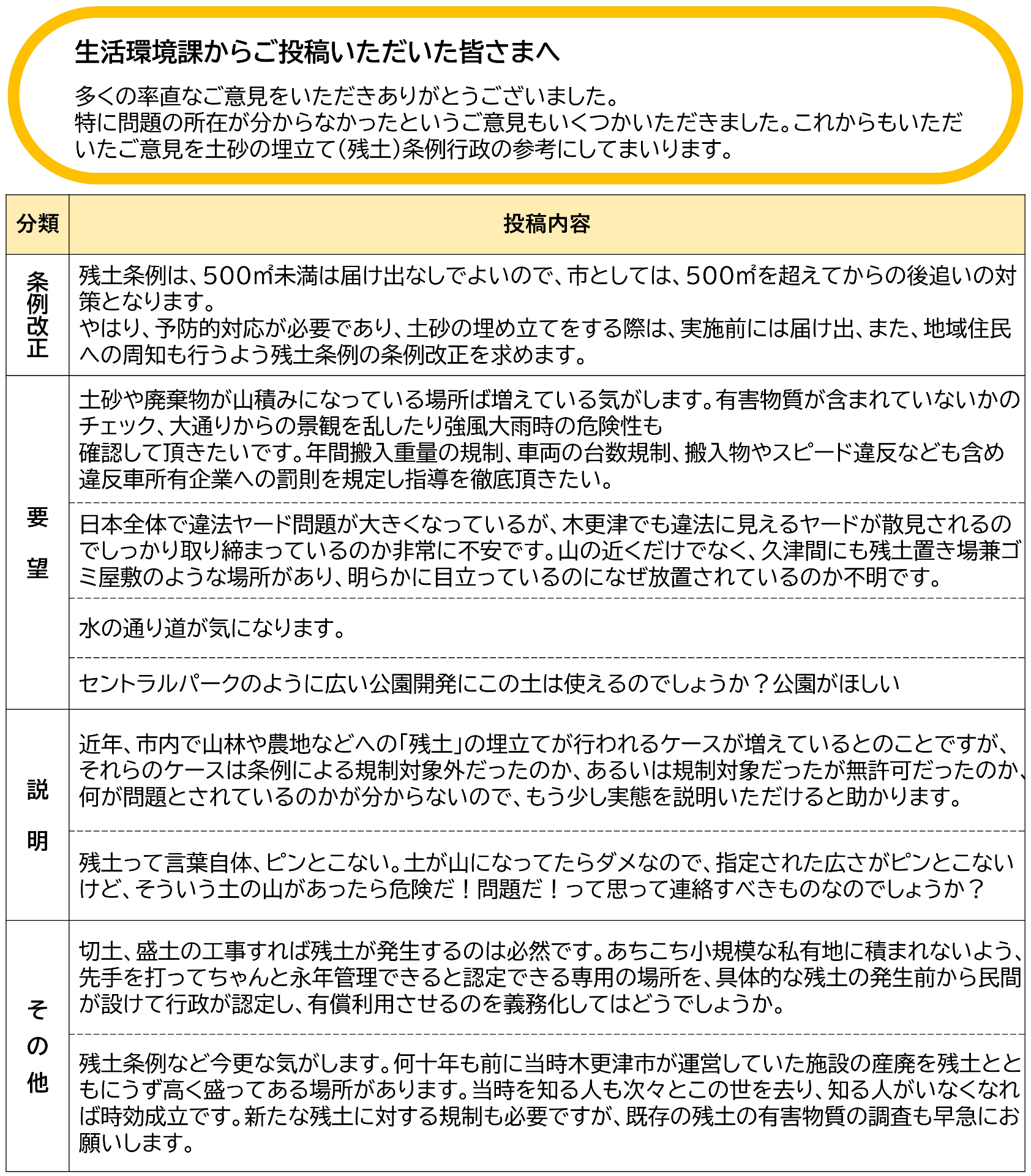 現在、「残土条例」の見直しを検討していますが、その前に、市民のみなさんが生活の中で感じていることや、気づいたことをお聞かせください。